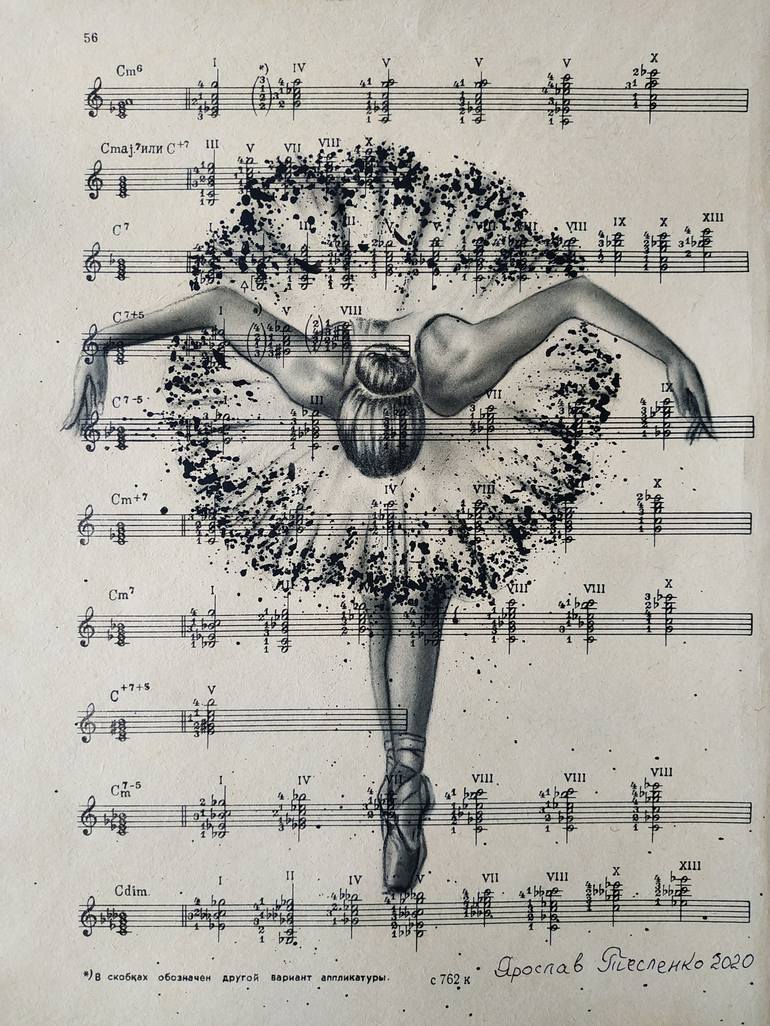 In my next picture, I drew a ballerina on old pages with notes. Music and dance series. The beauty of the female body, the beauty of the dancer, the ballerina... inspires new works...Drawn in charcoal and added splashes of acrylic on a white ballerina tutu. This charcoal and acrylic work is no frame...