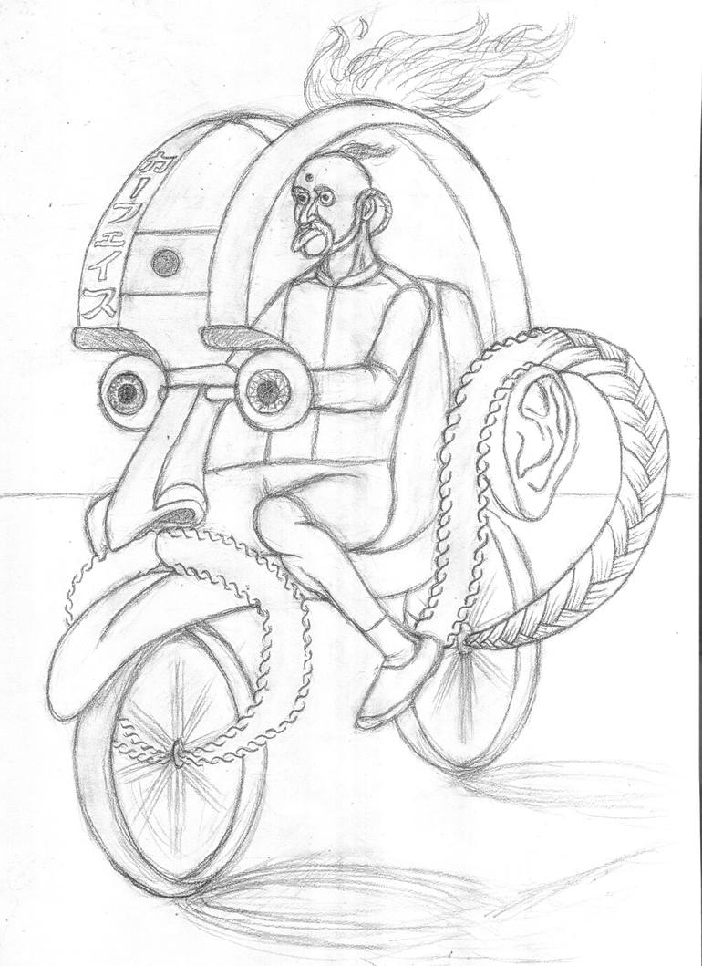 Man riding a vehicle that resembles his face. An infinite loop of fractals.