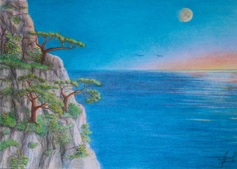 In the drawing I conveyed the beauty of the sea at dawn. The first rays of the sun above the horizon and a couple of birds. Birds as a symbol of freedom, love and life.Spread your wings and take off. The main plot of the landscape. I tried to convey the lightness and warmth of the morning in the dra...