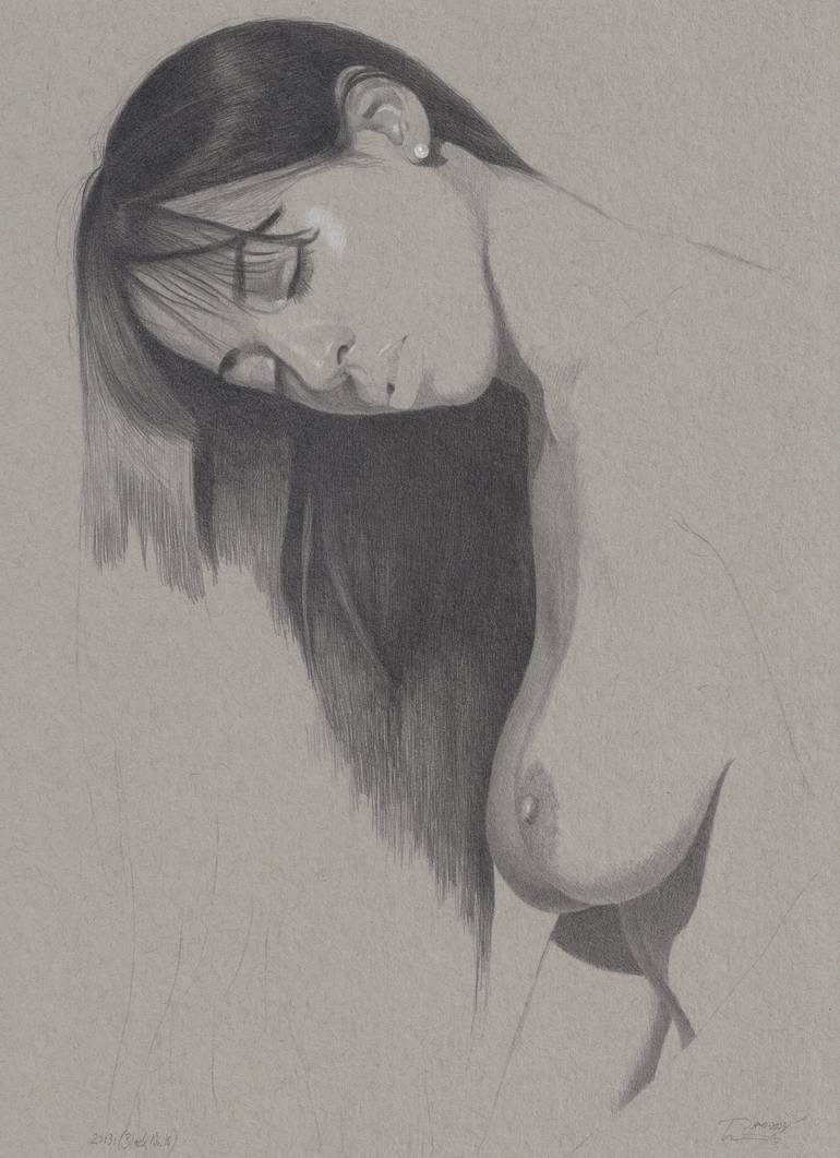 Angelica is one of my favorite models because her face alone with the full lips is an eye-catcher. Her long hair and overall appearance is remarkable. I love drawing such feminine curves! Sic est! Drawing is on grey toned Strathmore cardboard.