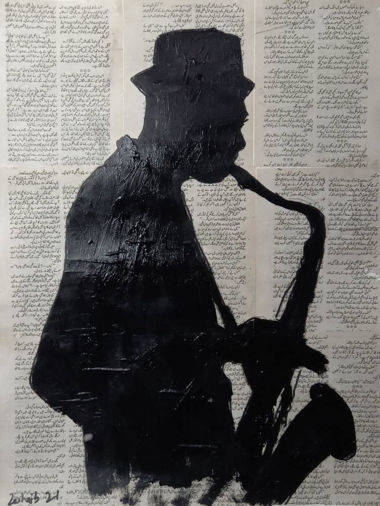 black men playing music with saxophone, reason to paint this to highlight the value of black people in society "Black lives matter" Black lives matter", acrylic on vintage book pages adhered together to create one sheet ready for framing , this is my new series silhouette on paper , complete paintin...
