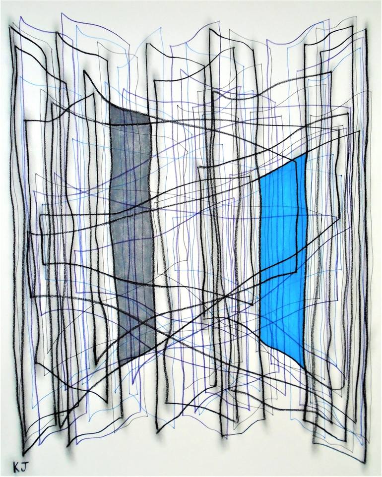 Linear expression inspired by the city; a composition using overlaid urban contours and two colours. Fixed with professional fixative and rolled between acid-free tissue paper.