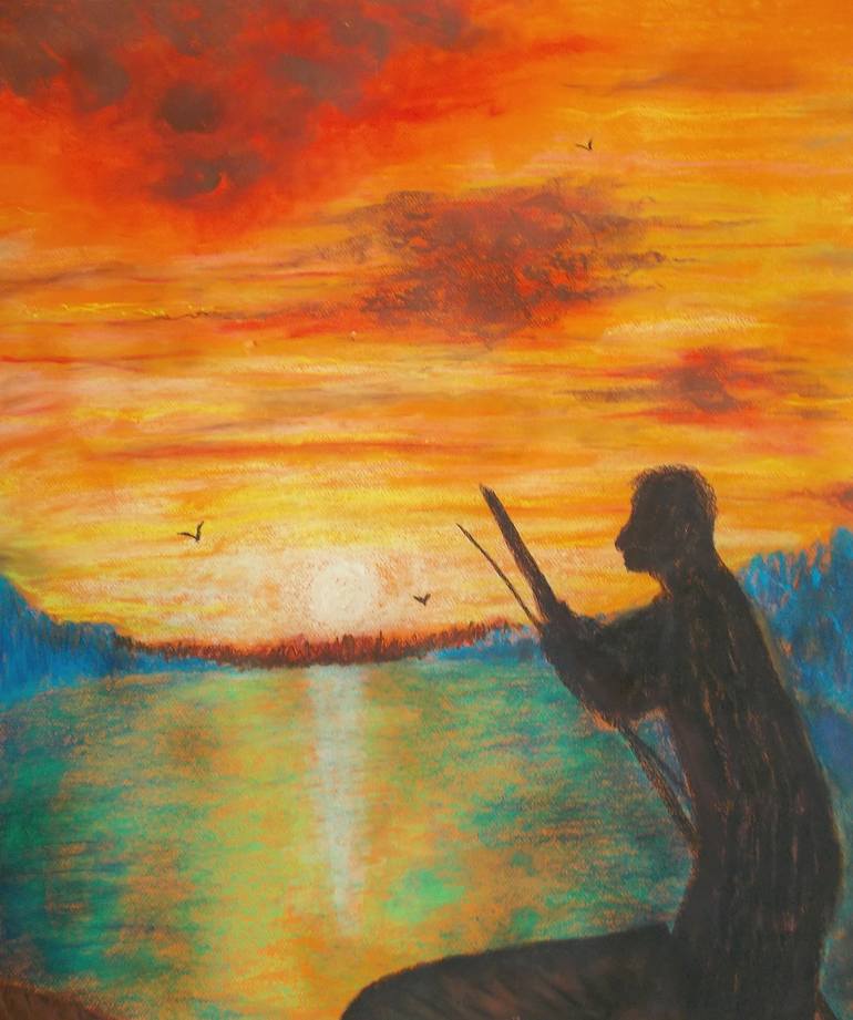 Chalk pastels on orange Tiziano depicting a lone boatman beginning to cross the lake underneath gathering storm clouds as birds fly in the distance.