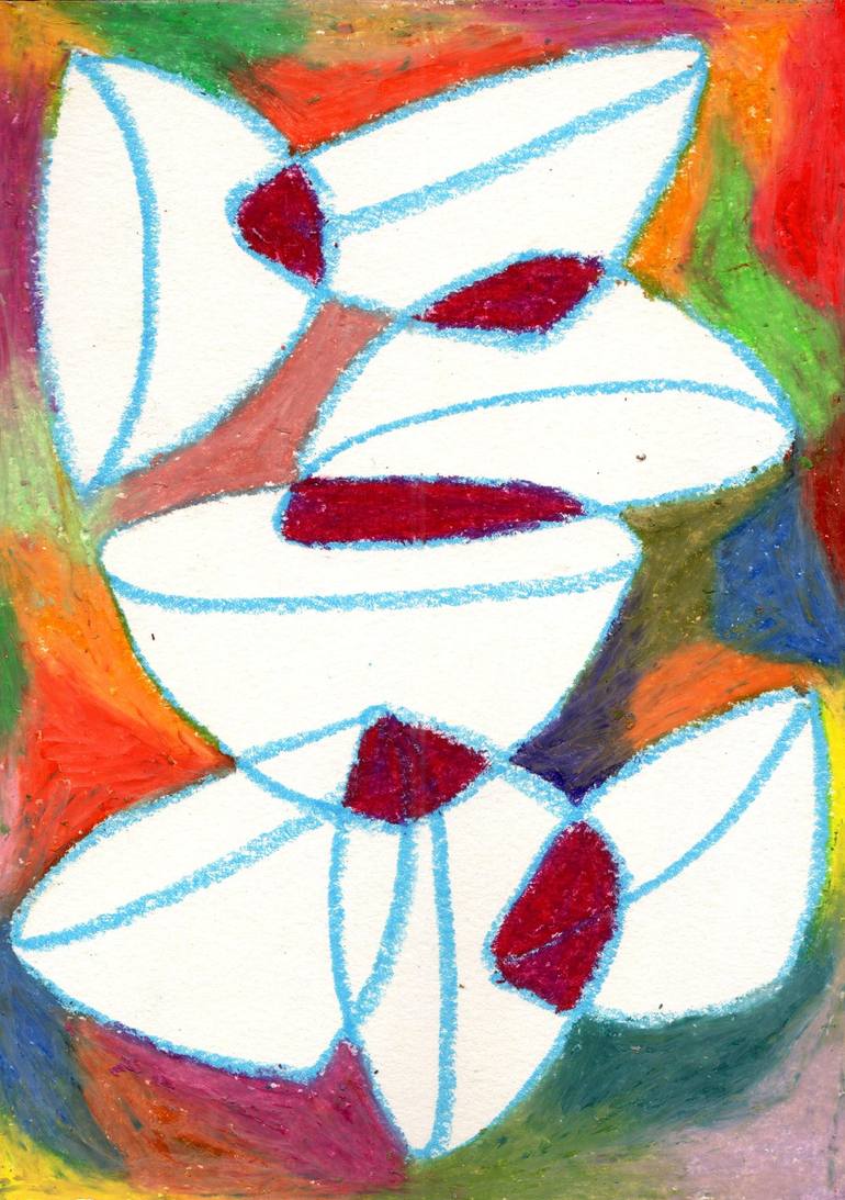 An intertwining of bowls as imagined by the artist against a background of various hues, bleeding into each other.