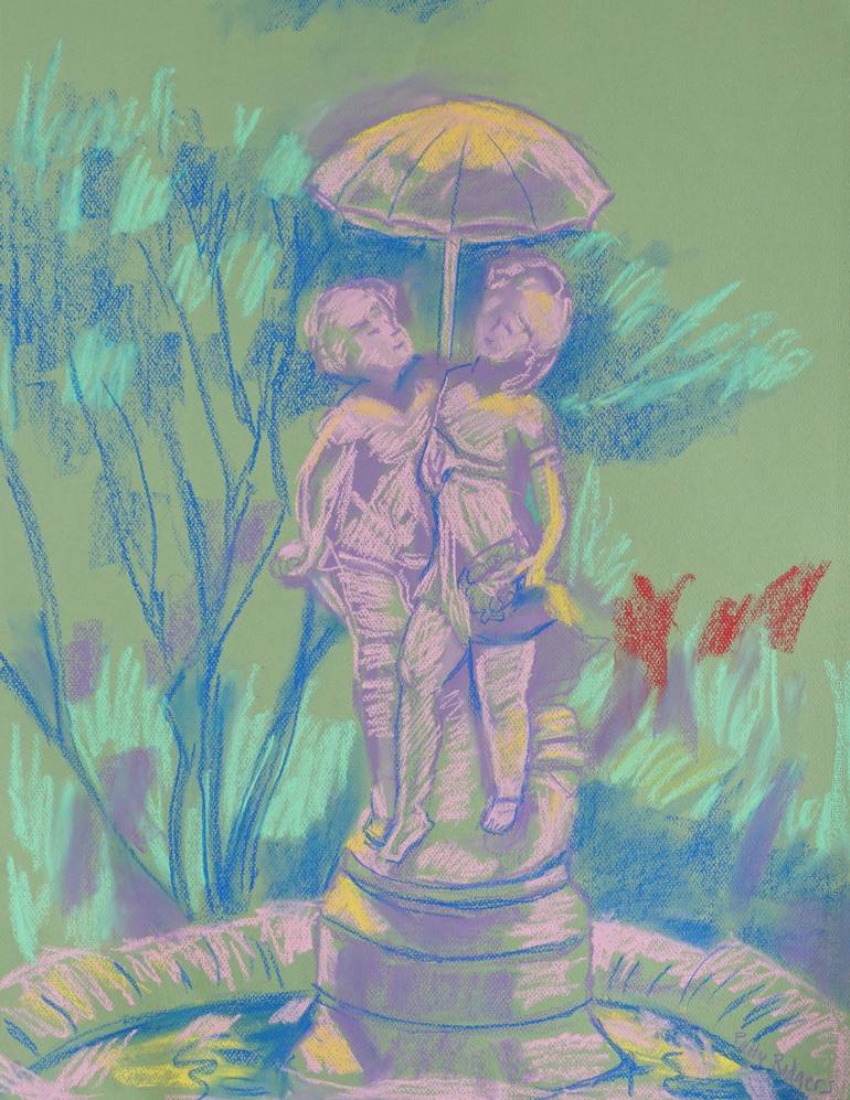 In my garden, I focused in on this boy and girl fountain, as a study for a painting. Using minimal pastel strokes of color on green paper, I captured the light on the object. Indistinct patches of blues and greens describe the flowers and greenery in the background. The fountain is lit up with pink.