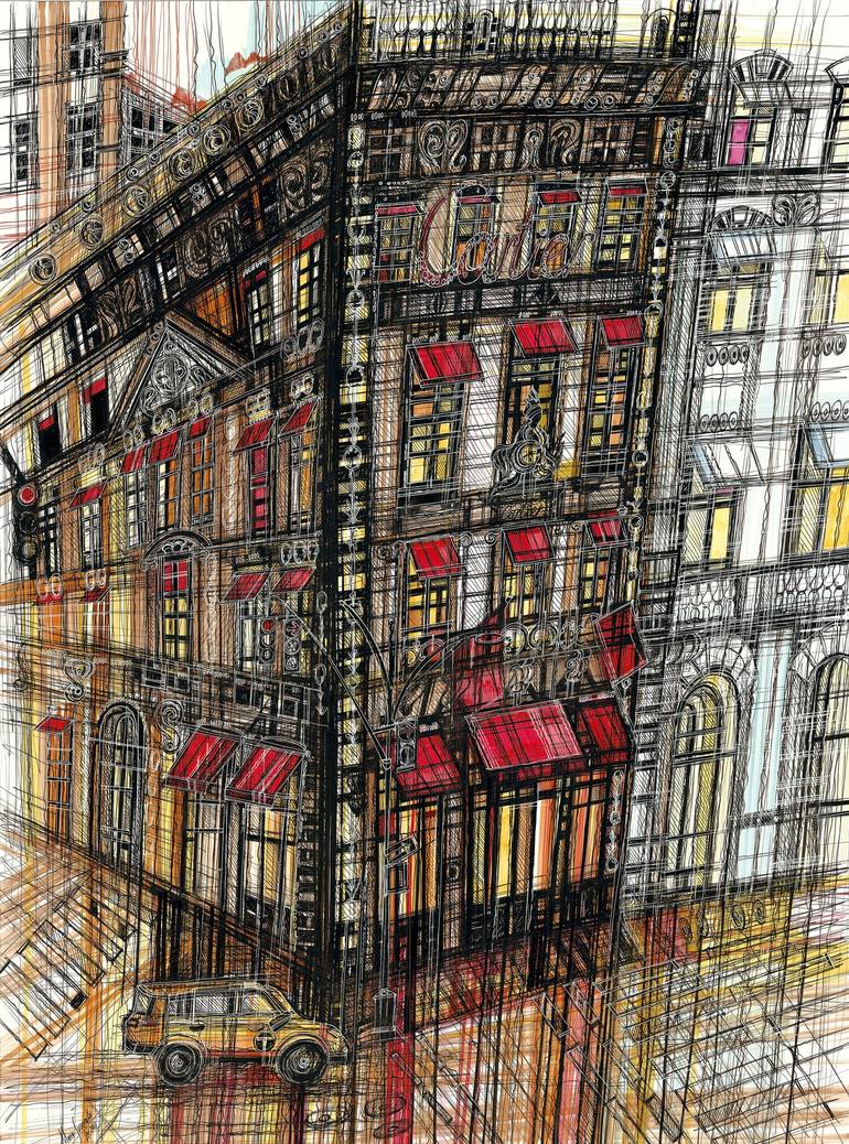 New York is one of the most inspiring cities on Earth! I love how beautiful the city looks during Christmas holidays. Cartier building always has amazing Christmas decorations and inspired me to create this artwork. I created this artwork using different graphic tools, markers, liners on a cardboard...
