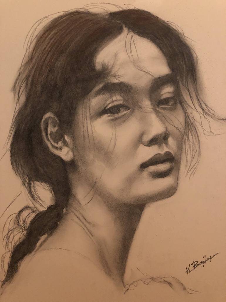 This evocative portrait captures the delicate harmony of a young Chinese girl's smile. Rendered with charcoal, graphite, and conte on toned Fabriano paper, the drawing showcases a mastery of technique, bringing forth a captivating likeness with subtle nuances of light and shadow. While creating thi...