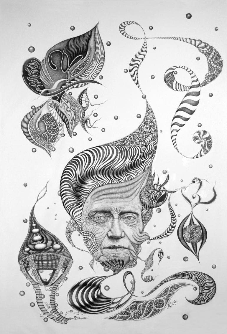 Alixire est toujours fascinée par le regard. Ici, c'est celui de Christopher Walken, célèbre acteur américain. Elle a entouré ce visage captivant par ses volutes dont l'étrange magie est une écriture fantastique qui renvoie à son univers où l'onirisme côtoie le réel. Elle s'attache, dans ses portrai...