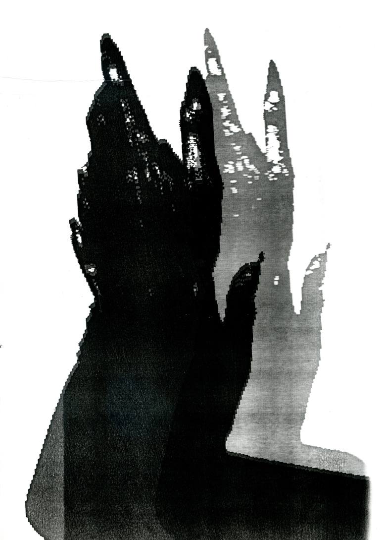 First I photographed an artist of a Flamenco house in Madrid clapping her hands. Then I developed the image in Black and White, and Xerographed it. Then I copied the image in a fax machine, and used the resulting image again in a Xerographic process, creating two layers. I selected one of the final ...