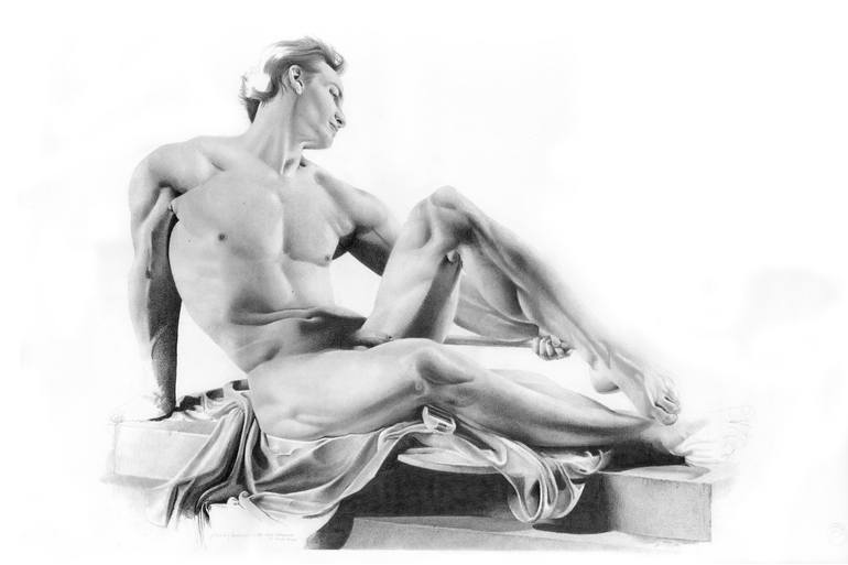 this 20" x 30" graphite pencil drawing, on Strathmore 500 Bristol paper, is the fifth drawing of friend and model Clyde Waterhouse. Using a reference photo of the classic marble statue titled Achille's Wound, and a portrait of Clyde taken by world-renowned photographer David Vance