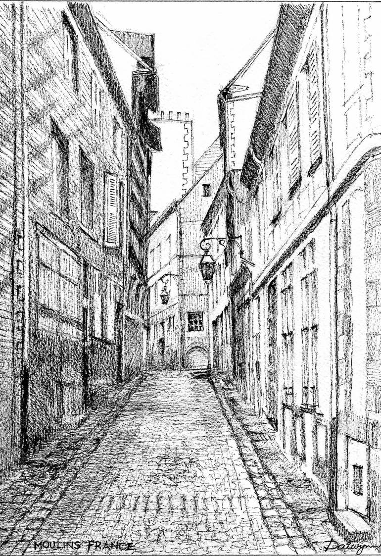 Pencil, pen and ink freehand sketch of a narrow cobbled alley in Moulins. This charming town lies on the Allier River, just north of Vichy, France. Sketched by Dai Wynn from a reference photograph he took when staying in a château in the region. 21 cm high by 14.9 cm wide by 0.1 cm deep approximatel...