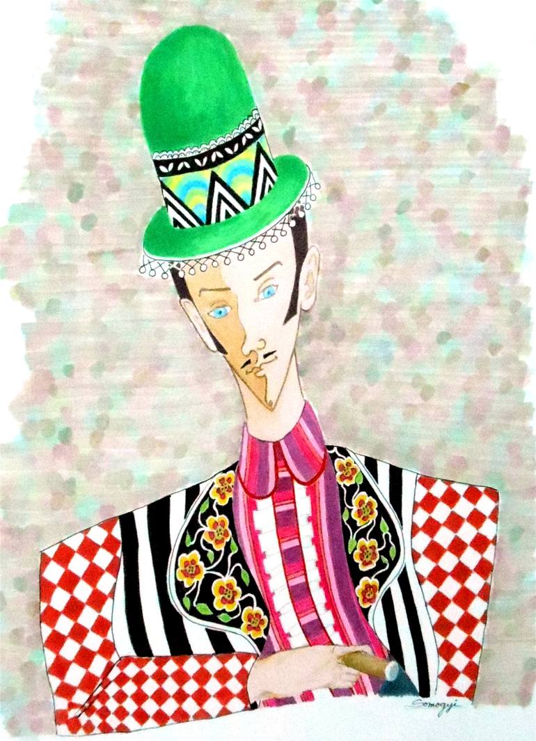 11x14, art markers, ink, colored pencil on 100-lb. bristol board. All media/materials used are archival quality. This is a stylized, whimsical version of my work entitled "Hungarian Dandy with Cigar, 1930," also available on this site.