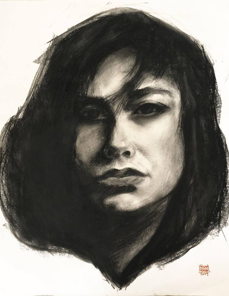 Charcoal drawing of a young female with dark hair.