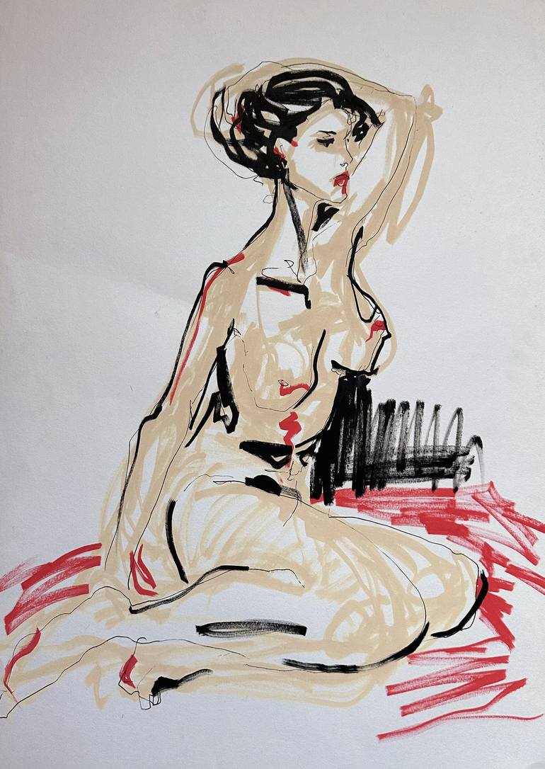 Large (A2 size) life drawing from model. Acrylic paint pen on white paper.