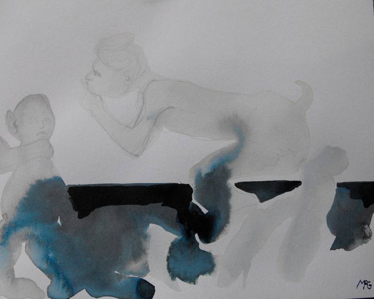 This drawing is ink and pencil on paper. It belongs to a serie about still life. Here two little imps are two sculptures set on a table.