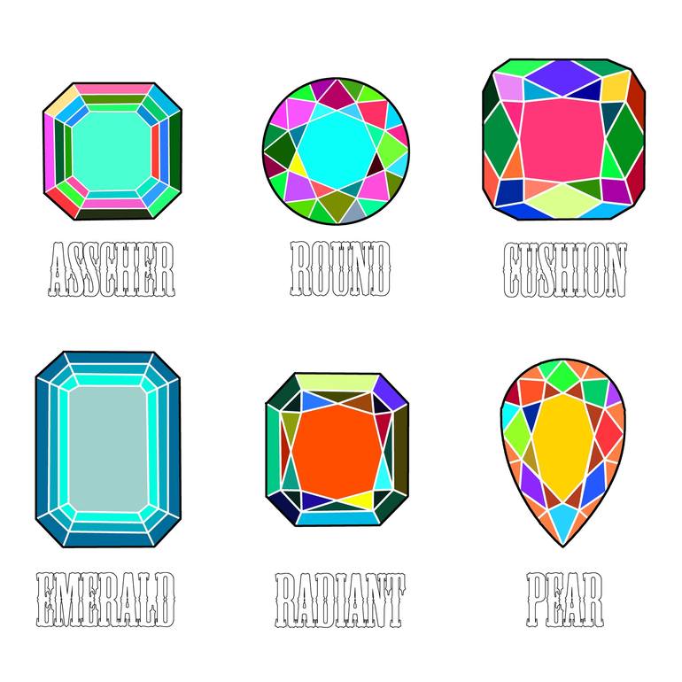 Diamonds in different Cuts. Labeled and given a colorful Pop Art look about them.