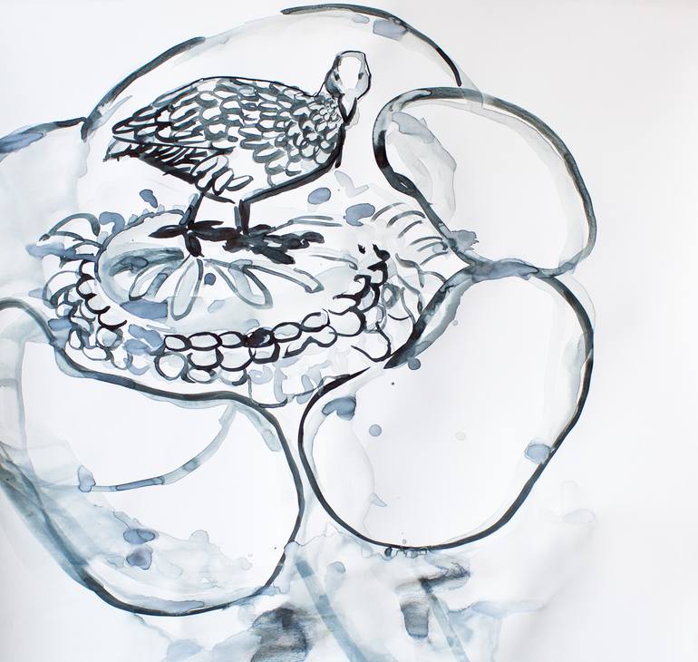Ink drawing on paper. 2020 The Eurasian coot are dreaming about a big Water Lily.