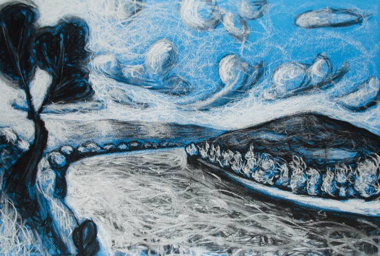 Charcoal and Chalk on blue Paper. The drawing is done by my personal style and my representation of nature. In this drawing, I mostly researched with lines and light. I wanted to destroy the surface of nature so that it explodes. "Drina River" is located between Serbia and Bosnia and Herzegovina. ...