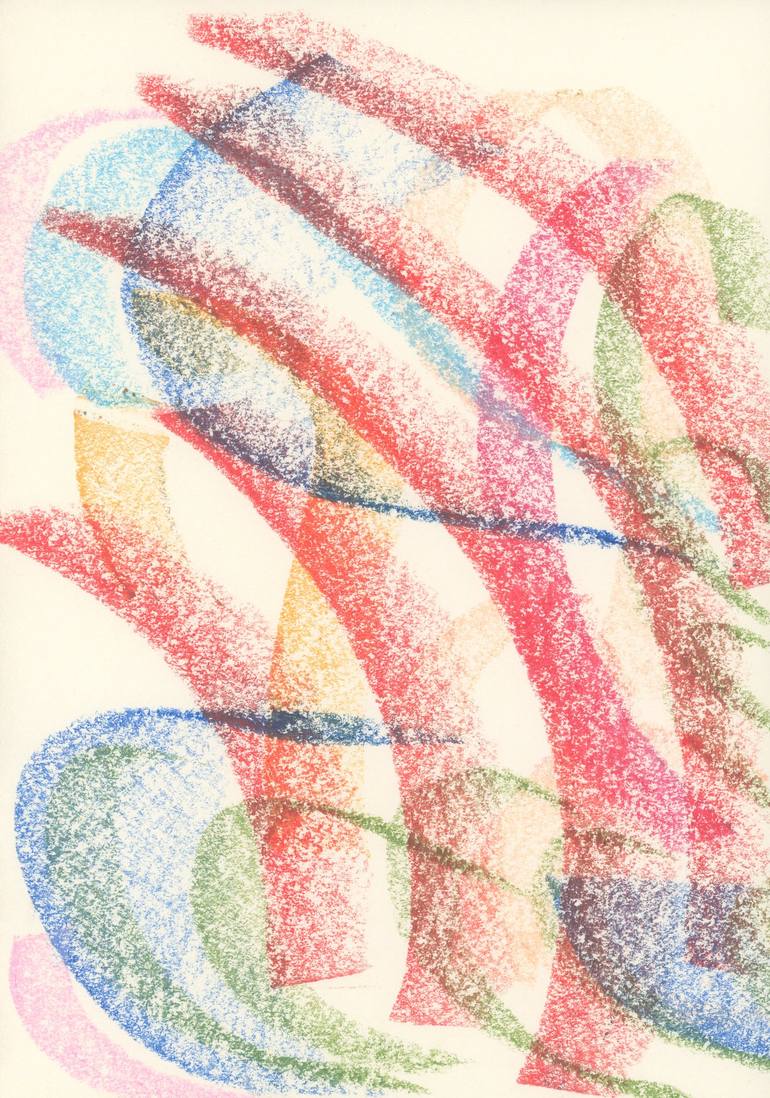 This oil pastel drawing is an abstraction of the artist's intentions to recollect memories from childhood. The artist's achievement of this composition was spontaneous and is expressing the colorful environment of her grandmother's sewing studio where she was taught to embroider, sew and cut fabri...