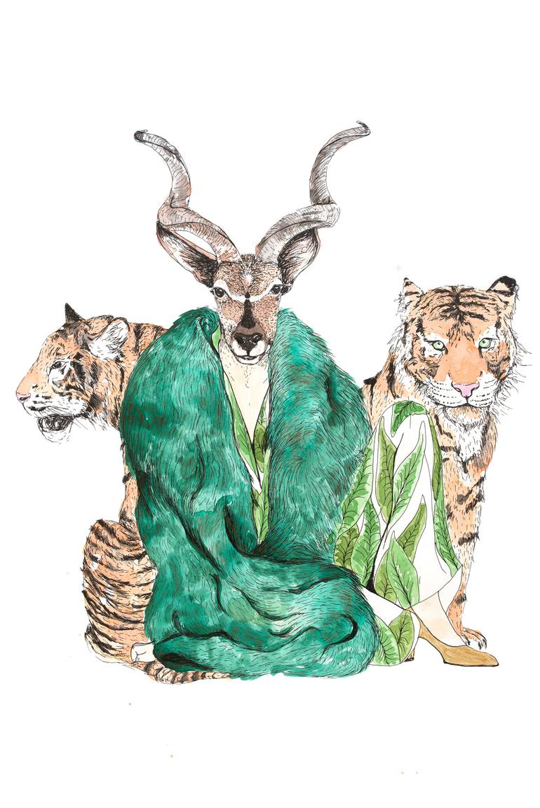 "Eleanor used to collect balloons, but they kept popping or deflating and unexpectedly breaking her heart, so she decided to collect tigers instead, so far so good." This painting is an ink and watercolor portrait on paper, it features a rather glamorous female kudu, wearing a 7o's Yves St Laurent ...