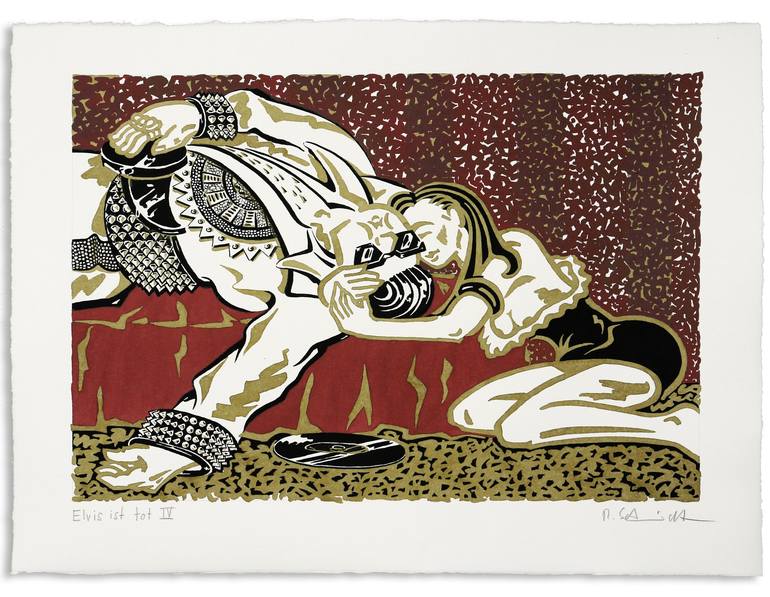 The figure composition resembles classical Pietas, as by Botticelli. Elvis as a deceased idol. Wept in a quiet, intense way by a compassionate admirer. Used glazed, liquid acrylic paints, sometimes mixed with ink, applied with a brush on handmade paper. The size of the handmade paper with the drawin...