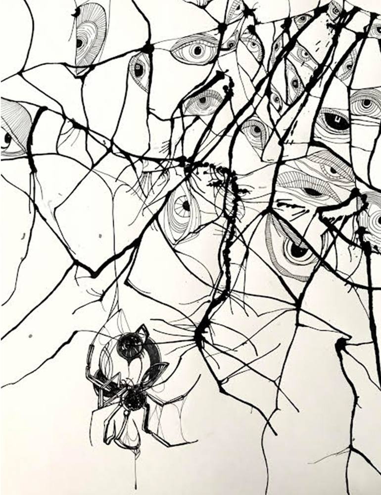 The Internet is the hardware upon which the spider-like connections of the World Wide Web have been created. Though sometimes we feel trapped in this monolithic spider web. I used India ink on 18 X 24 inch paper