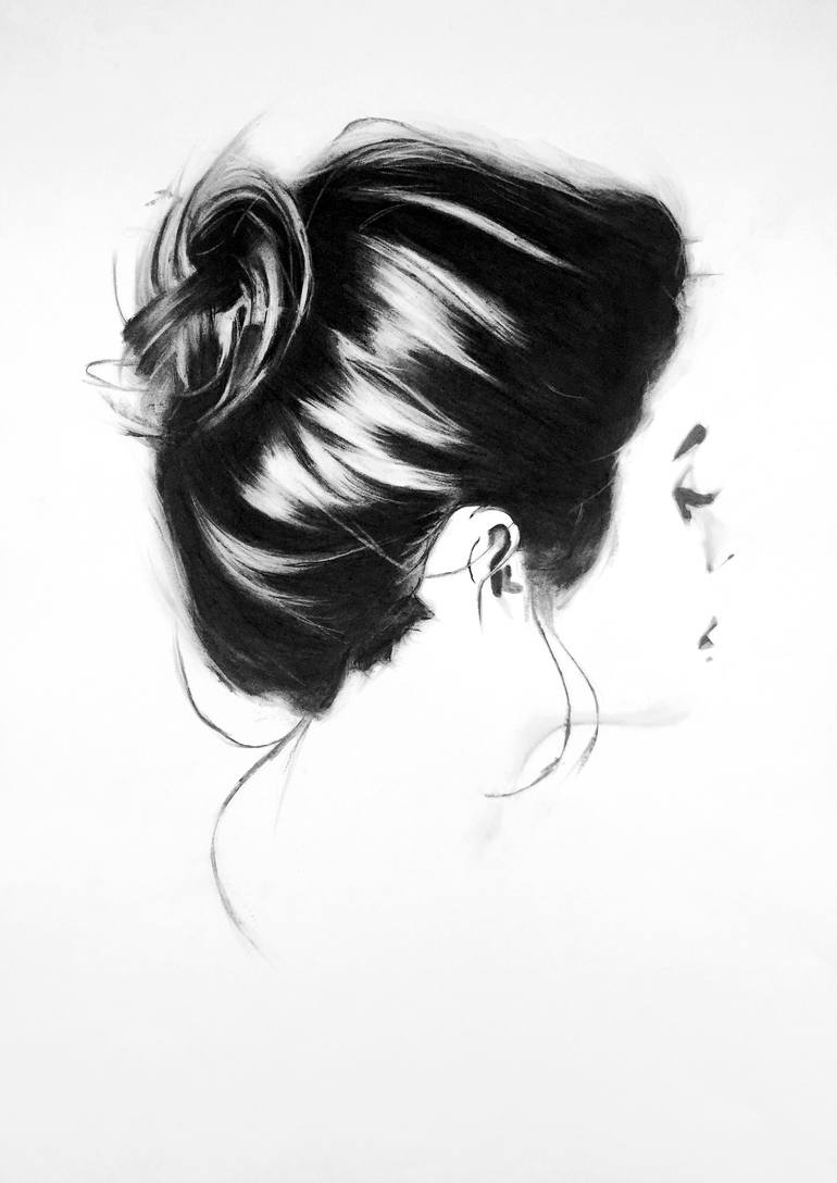 charcoal drawing on paper of a girl seen from behind. focus is about the hair and nog te face