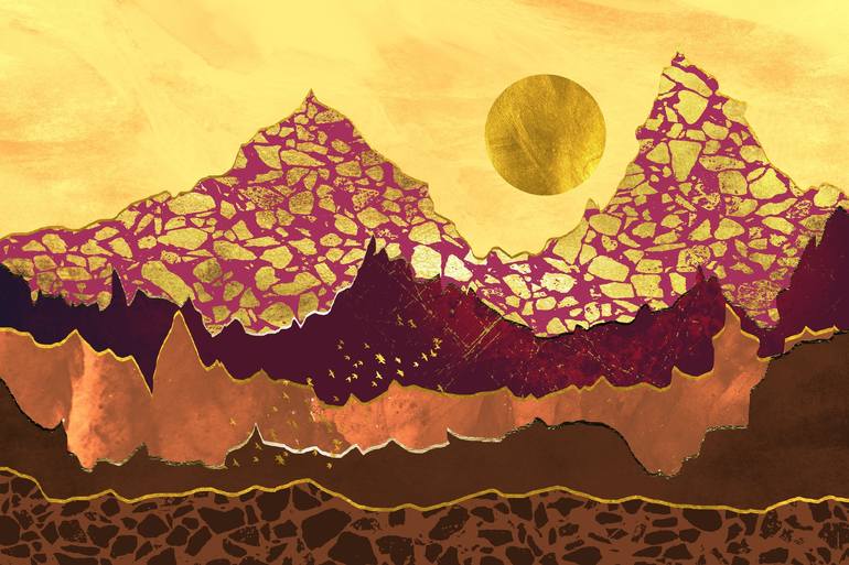 A colorful and extravagant sunset landscape with golden patterns and colors.