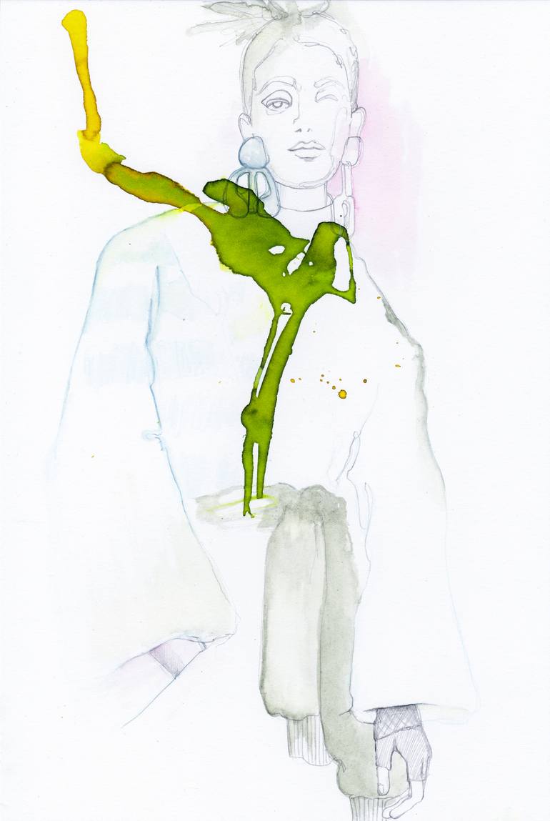 Fashion illustration focused on effect of a 'pop' of color, combining fluid, undefined shapes with realistic elements.