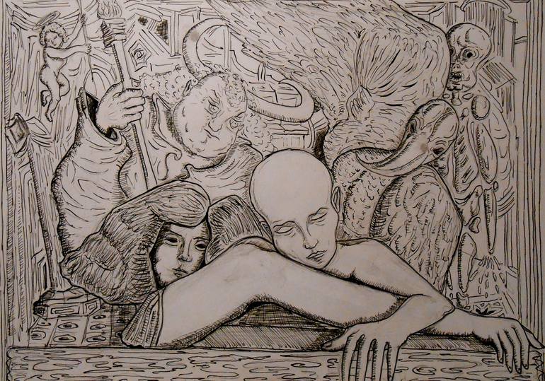 Based out of a modest home studio in New York, De Yos is a Painter, and Draughtsman, whose work deals primarily in the chaotic flux that is Human Nature. His work explores the tensions between this element and, technology, superstition, the family unit dynamic, and lastly, what he has come to term as ' The myth of progress'. Much of the time the work is laced with a strong personal aspect, and in style is quite expressive. Now in his mid fifties, De Yos has wielded some sort of mark making implement in his hand as far back as his memory will take him. Although he has had some formal technical instruction-much of it through books and literature- De Yos is mostly a self taught painter, yet, one well versed in all aspects of the history of Art. He often draws upon this breadth of knowledge in the creation of his varied style of works.