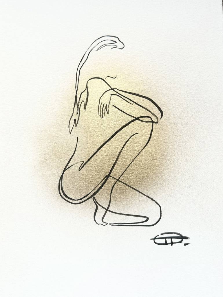 Stylish image for modern interior decor. The female figure is made in a minimalist line art style. The background is made with gold spray paint. Smooth lines emphasize feminine plasticity and tenderness. The painting has a black modern frame with mat.