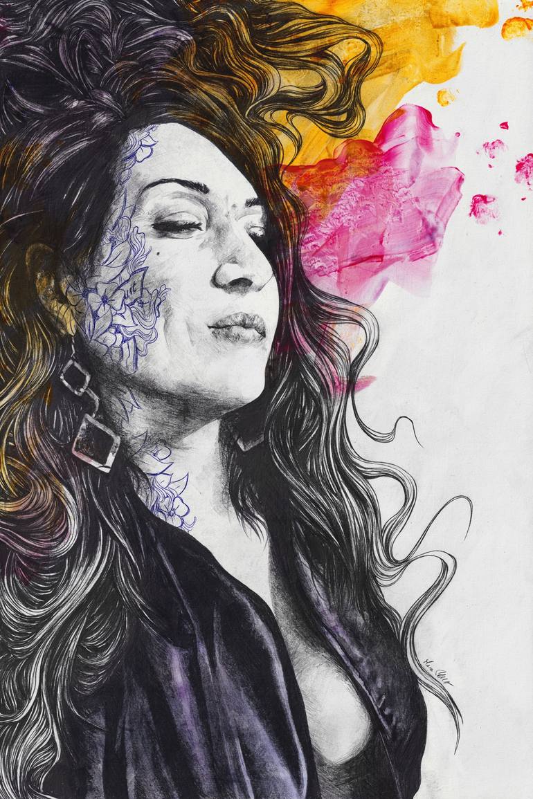 • Figurative drawing, an elegant lady standing in a sensual pose with an open jacket showing her beautiful neckline. Model: Lucia • Graphite pencil and acrylic • 220 g/m² Fabriano paper, 60x40 cm (24"x16") • Original artwork, one-of-a-kind, handdrawn and handpainted. • The sheet will be carefully ro...