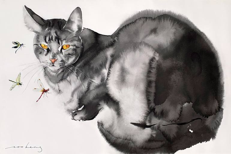 Cat watches in bewilderment of flighty dragonflies around. Ink and watercolour on Saunders Waterford 300gsm smooth cotton paper.