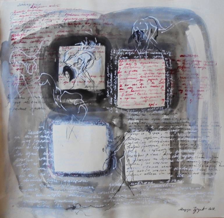 Marija Djuric Born in Bajina Basta, Serbia, 1971.Since 1996 she has been teaching Drawing and Painting at the School of Design. Lives and works in Belgrade.Mother of three children, My drawings: Drawings generated by spontaneous gesture that derives from the process of drawing and nature of the proceedings technique. Almost ritually begins the process of drawing gesture and subconscious mechanisms. Gestures are leading to narrative, without any intention to associate. Lines form abstract forms, figures hint to the figures in the movement that reflects precisely the process of drawing. Form as a contour line does not exist. The composition is dynamic, intertwined areas and move that intersect permeate and construct a space that is alternately deepens and returns to the surface. Hustle to move and move stems from the intimate transmission of the subconscious through water stains that precedes stroke brushes and ends with the edge of the pen points or needles and thread. My paintings: Meditative records are a topic which I have been dealing with for some time. This time the words written acrylic on the canvas. The female nude dancer in dance ecstasy.Expressive strokes and movement figures trying to convey energy, which leads to the merging of the material and the spiritual. Painting is a complex, abstract artistic entity. Multiple layers makes it vibrant. My icons: All the icons in this album are copies, performed by reproductions. This series is a tree pears, in the rough, somewhere and bark from wood. Through a fine layer of stain Egg pigments, everywhere are traces of texture of rough processing of wood, unless impregnated gauze, and is then lining - texture of coarse canvas. It is gilded with slag-metal golden sheets or golden acrylic tones. They were made as copies, and in fact none of them is the same. Varnished matt varnish and patina. Rustic dominates the relief of lace, which gives a special atmosphere.