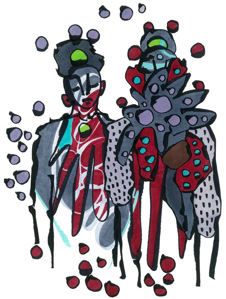 This artwork captures the elusive and fluid nature of dreams—where forms dissolve, merge, and reappear in new, unexpected configurations. The figures seem to exist in a liminal space, their contours undefined, as if they are slipping between memory and imagination. The interplay of deep reds, cool ...