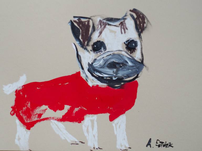 French Bulldog ready to walk drawing pastel/gouache on paper