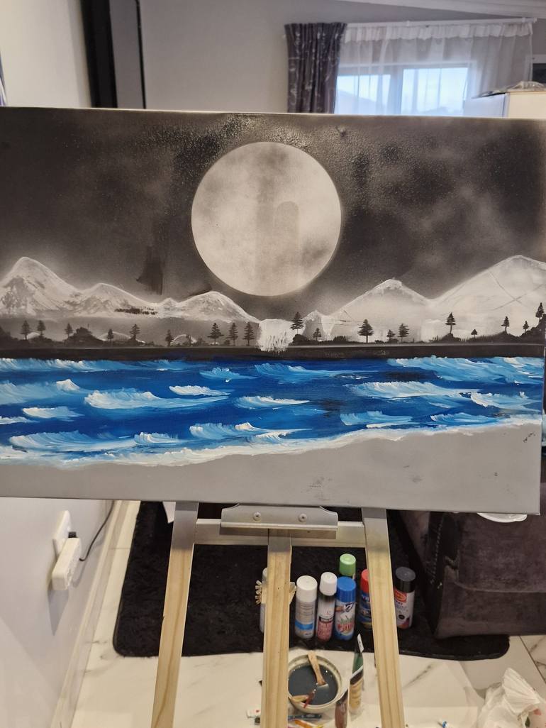 1. What/who inspired the work? The work might be inspired by the serene beauty of nature, particularly the calming presence of the ocean and the moon. Perhaps it’s a reflection of a peaceful moment you've experienced by the beach or a sense of wonder inspired by the night sky. The moon often evokes...