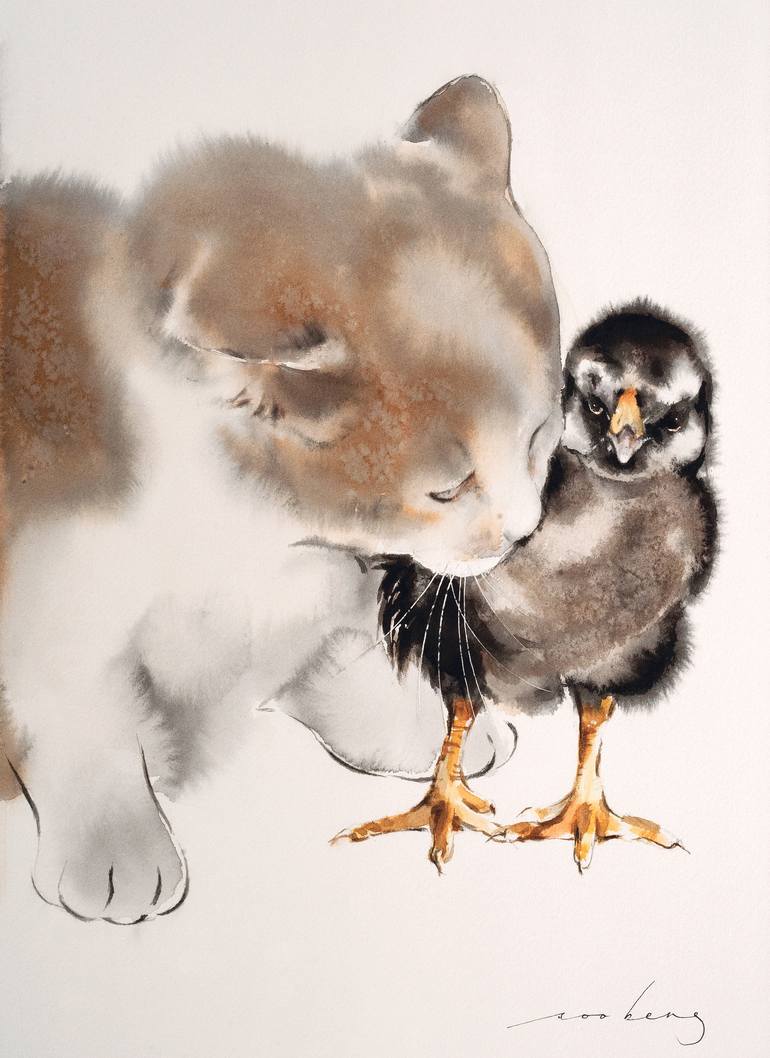 Young furry and feathered friends enjoying a unique bonding as best mates. Ink and watercolour on Saunders Waterford 300gsm cotton paper.