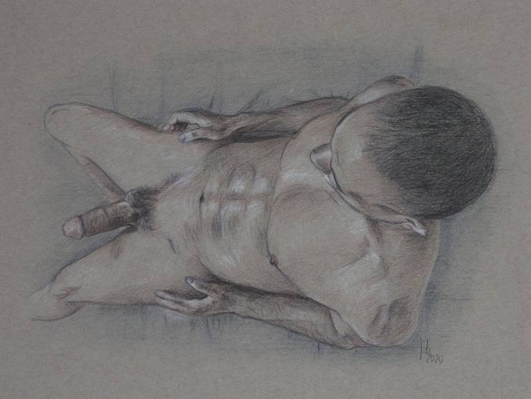"Giovanni reclining nude" is a colored pencils original drawing by Jorge Bandarra. It was done on Strathmore toned gray paper, 2020. The drawing is signed. The model was Giovanni a friend from New York City, the reference some photos he sent me.