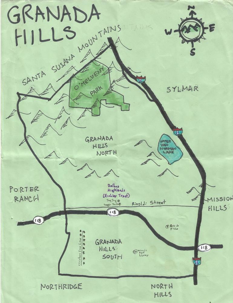 Granada Hills was the first Los Angeles neighborhood I explored for "California Fool's Gold," back in 2007. It wasn't until 2009, however, that I began making maps during my exploration so this one was done after the fact... although small touches like the addition of Christmas Tree Lane were added ...