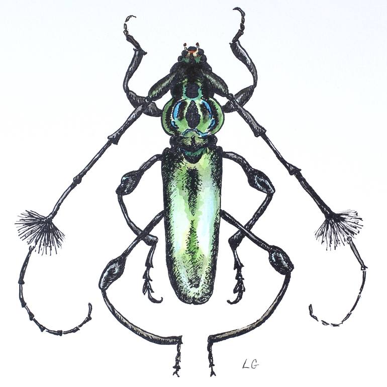 Pen and ink drawing of a Green Beetle, Cosmisoma. I love the fancy flounces on the legs of this little beetle! During 2020 I have been exploring the wonderful world of beetles. Incredible colours and crazy shapes. This work is sold with a cardboard mount but unframed. It will fit a standard frame ...