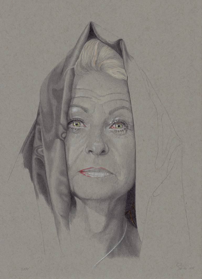 My older model Marga dressed like a holy Madonna. I loke her face and especially her green eyes. Drawing is on grey toned Strathmore Paper