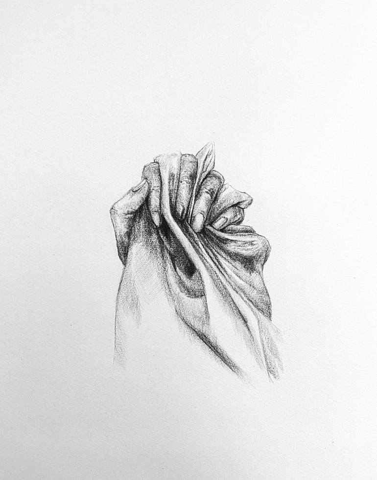 The artwork focuses on a hand tightly gripping a piece of fabric, the charcoal strokes conveying a sense of tension. The texture of the fabric seems to slip through the fingers, symbolizing the intangible nature of what has been lost. The tightness of the grip suggests a desperate attempt to hold on...