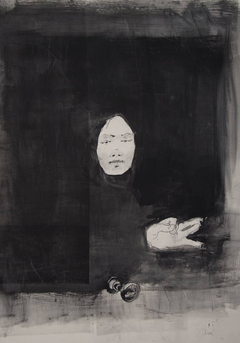 black ink drawing and monotype on 110g flyleaf paper, one of a kind, not framed, signed