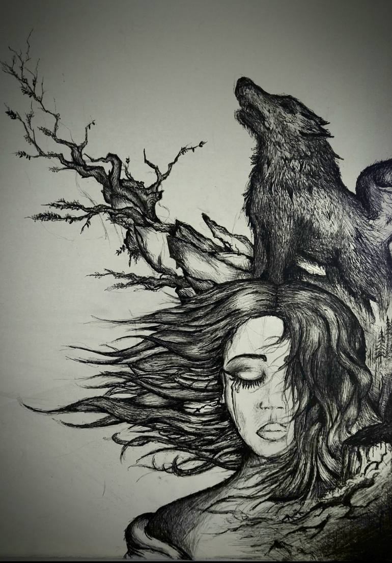 It's unclear who the monster.... Inspired by the tattoo on her arm, this drawing was a gift to her that never made its way. My drawings are simple ballpoint pen, but drawn straight onto a canvas, this creates a challenge as I cannot make a single mistake and canvas is typically reserved for pain...