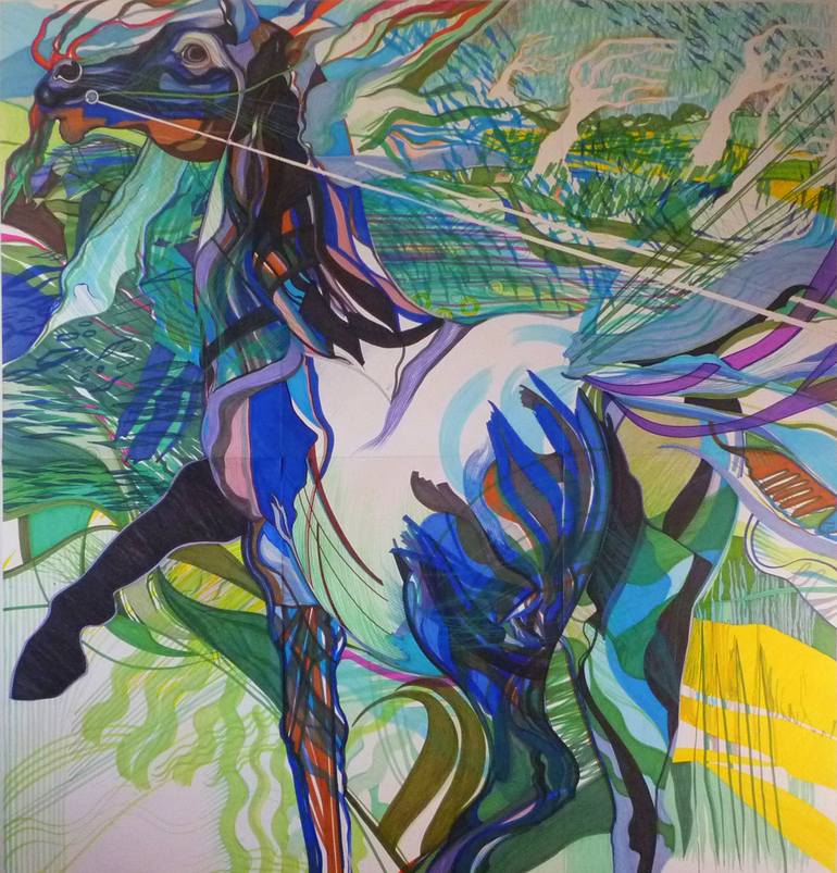 185x180cm-large, expressive, colourful felt-tip drawing depicting a horse at its center, in a landscape. Composed of 70x100cm sheets of paper taped together at the back. Foldable.