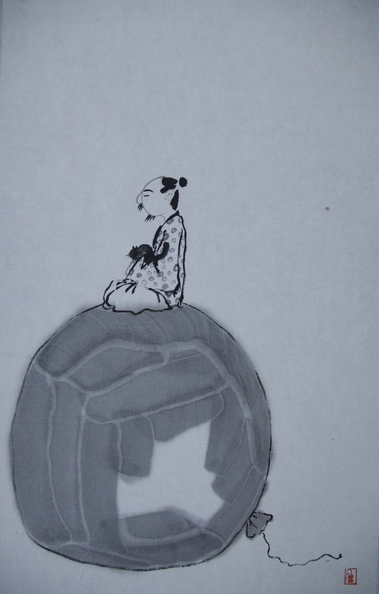 The old hermit and his cat (friend) live quietly on their mountain. They love every detail of life. Spread the ink on the yellow papyrus. The life of the old hermit looked more primitive.