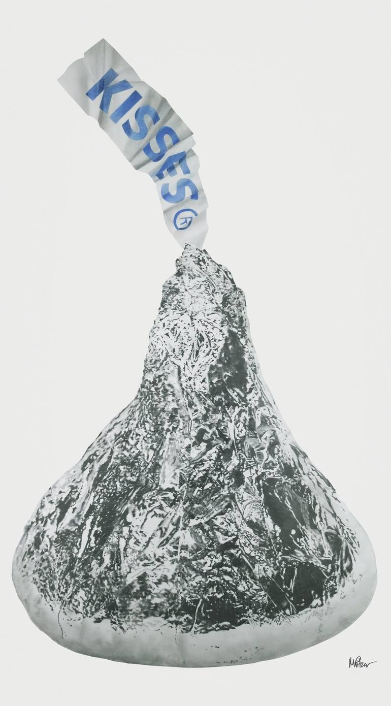 This pop-realism drawing presents a strikingly realistic portrayal of a Hershey's Kiss, rendered entirely in shades of gray to focus attention on form and texture. The surface of the crinkled foil is depicted with remarkable precision, capturing the interplay of light and shadow that gives the candy...