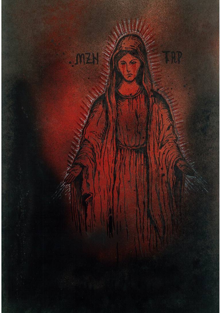 Spray paint and markers on paper. Holy Maiden. I painted this picture in the midst of the epidemic, when the whole world was locked in their homes.