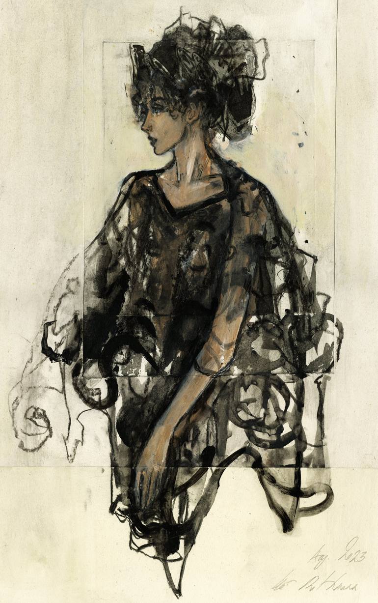 Drawing charcoal, watercolor, gouache and graphite pencil on paper with collage Aug. 2023 21" x 13,2" (53,5 x 33,5 cm) Signed and dated on the front You will receive a Certificate of Authenticity.